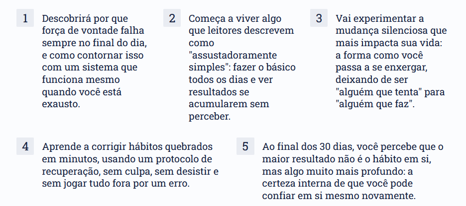 • Em poucos dias, você começa a acordar com uma sensação rara: clareza do que fazer, sem depender de motivação, inspiração ou vontade.